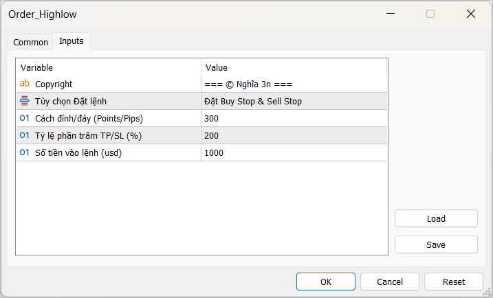 Kịch bản: Sau khi kết thúc một cây nến, bạn nhận thấy đó chính là cây nến tín hiệu. Bạn muốn đặt một lệnh "Buy Stop" hoặc/và "Sell Stop" theo cây nến đó với SL theo giá trị nhập vào! EA này sẽ giúp bạn!